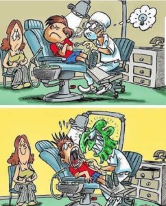 Here’s one way to open wide in the examination chair. This Dentistrypedia caricature gets the mother to smile as well.